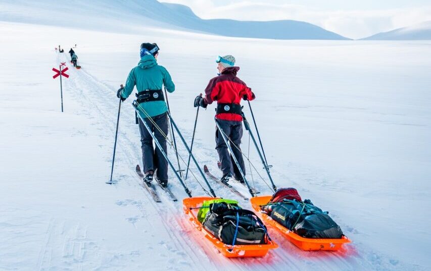De zomer brengt duizenden wandelaars naar deze route. Maar in de winter? Dan is de Kungsleden enkel toegankelijk op ski’s of sneeuwschoenen, wat betekent dat je dit magische landschap bijna voor jezelf hebt. Met een pulka – een kleine slee met je bagage – glijd je gemakkelijk door de sneeuw zonder zware rugzak. En het mooiste? Je hebt geen ski-ervaring nodig.